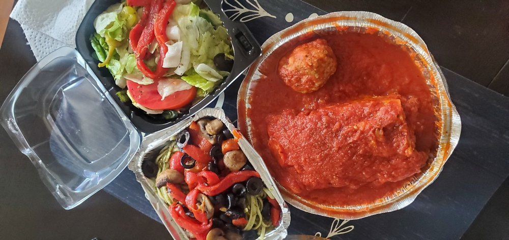 Eggplant parmesan, two stuffed manicotti, choice of ziti or linguini with meat sauce & a dinner salad