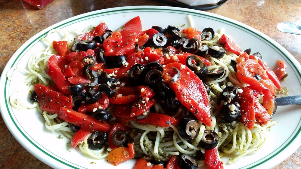 A rich olive oil & basil sauce with ground walnuts & garlic, sautéed with fresh mushrooms, roasted peppers & black olives & served with a dinner salad. Pesto sauce contains pine nuts & other ground nuts